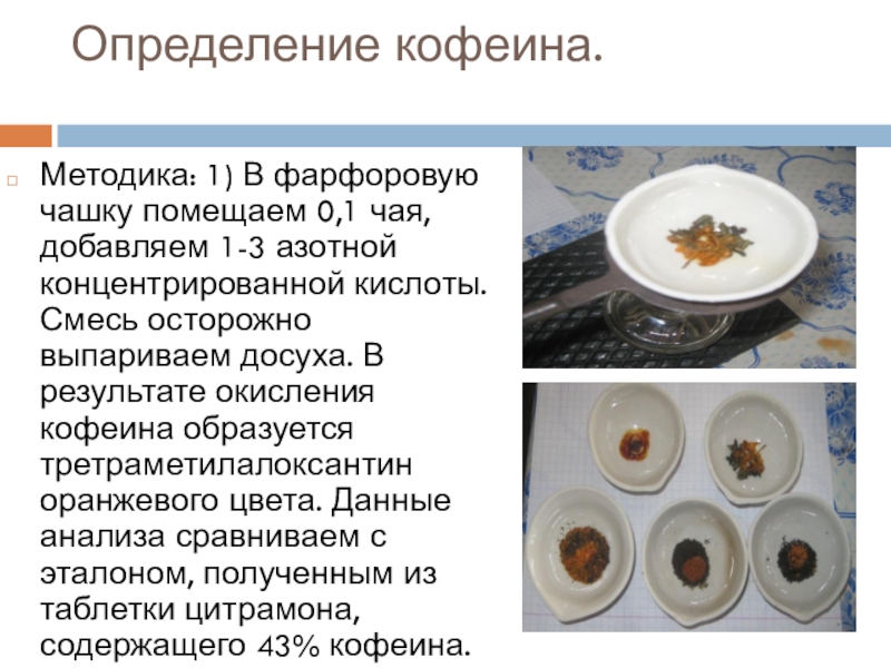 азотной концентрированной кислоты. Смесь осторожно выпариваем досуха. В результате окисления кофеина образуется третраметилалоксантин оранжевого цвета. Данные анализа сравниваем с эталоном, полученным из таблетки цитрамона, содержащего 43% кофеина.