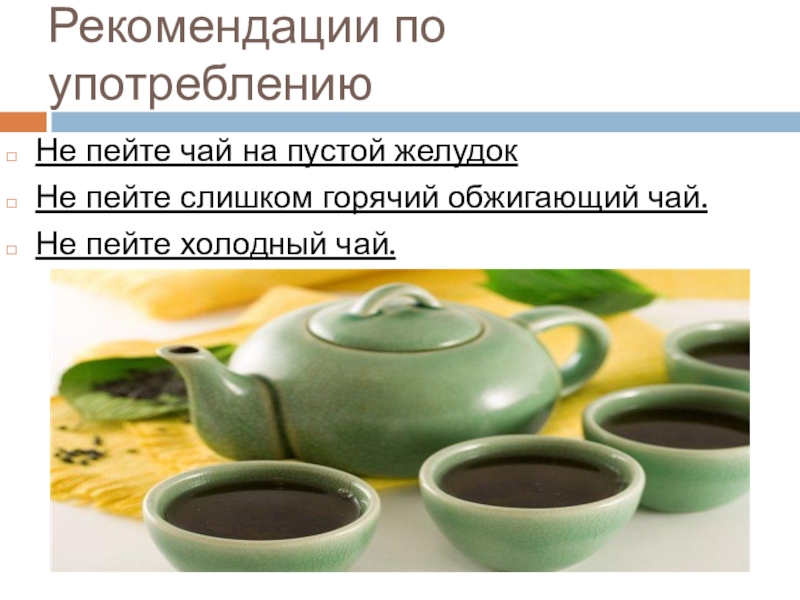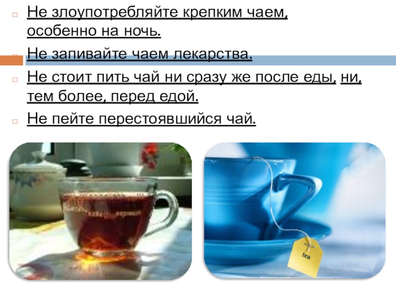 Слайд 25Не злоупотребляйте крепким чаем, особенно на ночь.
