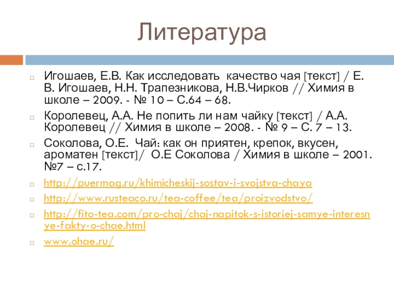 Соколова, О.Е. Чай: как он приятен, крепок, вкусен, ароматен [текст]/ О.Е Соколова / Химия в школе – 2001. №7 – с.17.