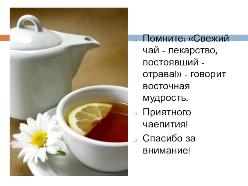 Слайд 27Помните: «Свежий чай - лекарство, постоявший - отрава!» - говорит восточная