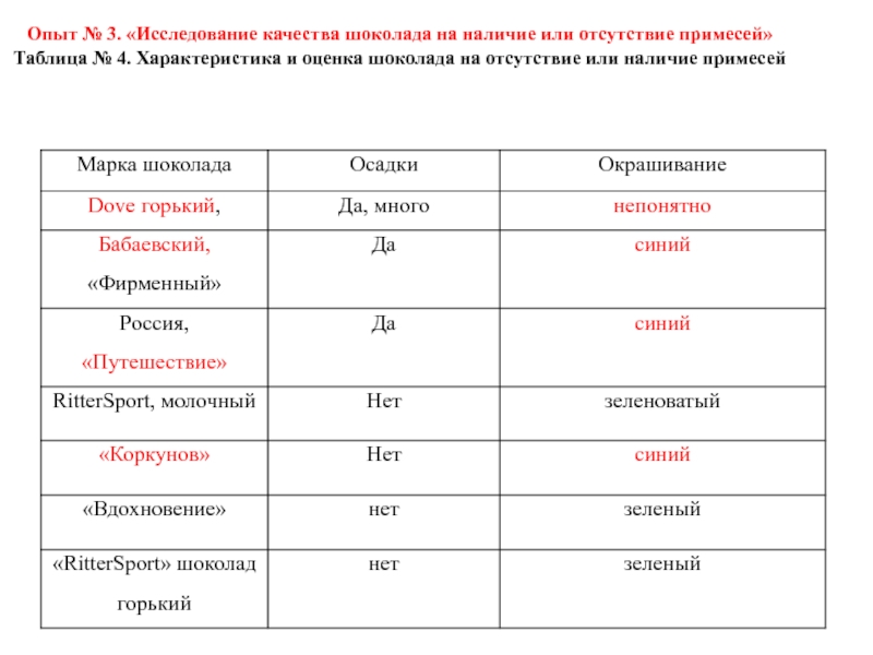№ 4. Характеристика и оценка шоколада на отсутствие или наличие примесей