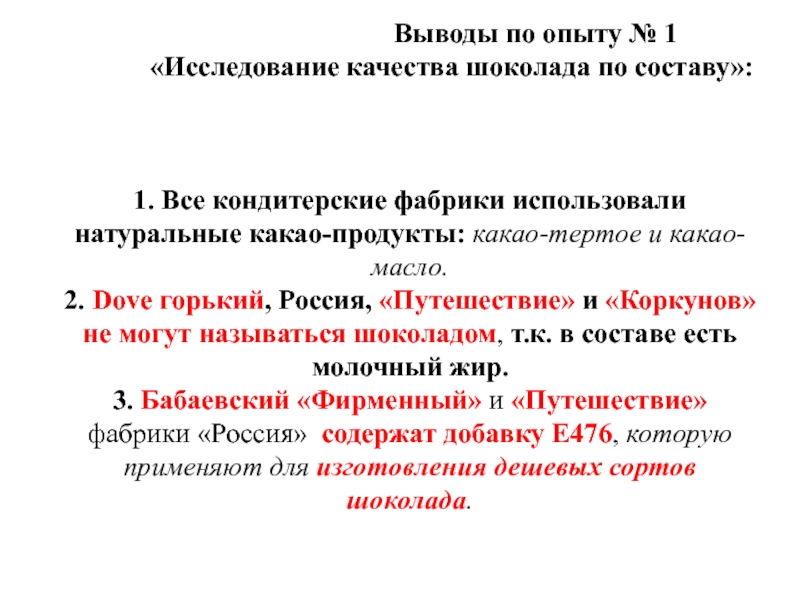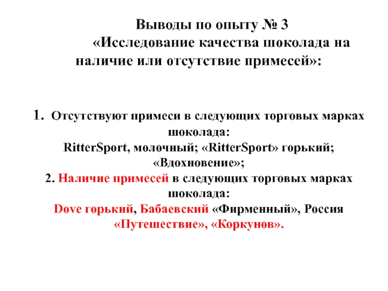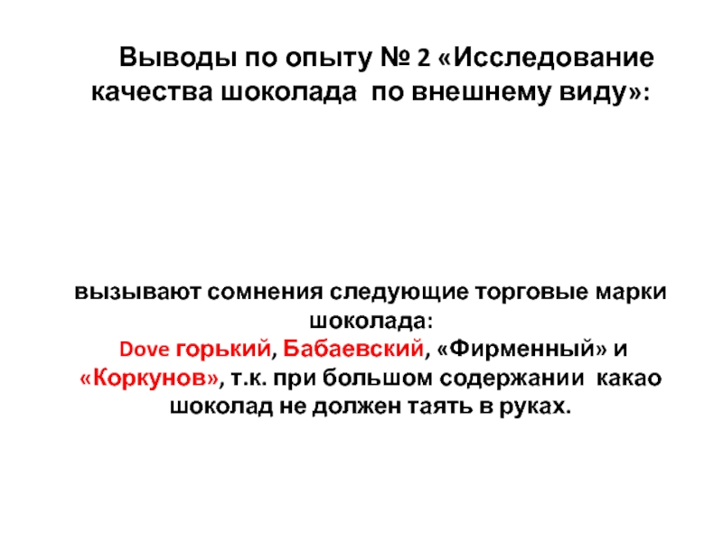 Слайд 14 Выводы по опыту № 2 «Исследование качества шоколада