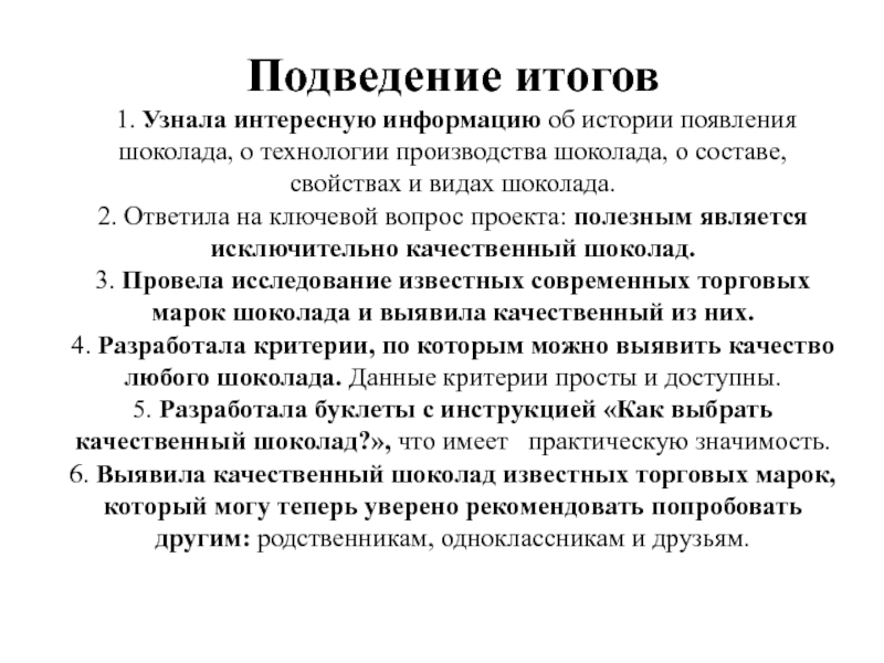 6. Выявила качественный шоколад известных торговых марок, который могу теперь уверено рекомендовать попробовать другим: родственникам, одноклассникам и друзьям.