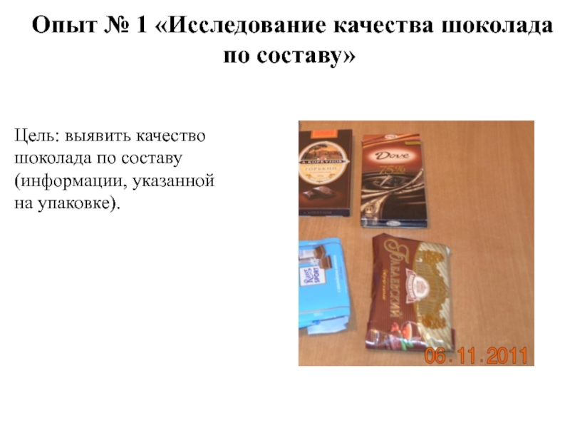 Слайд 11 Опыт № 1. «Исследование качества шоколада по