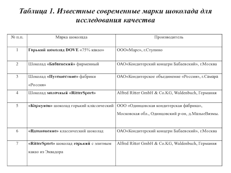 Таблица 1. Известные современные марки шоколада для исследования качества