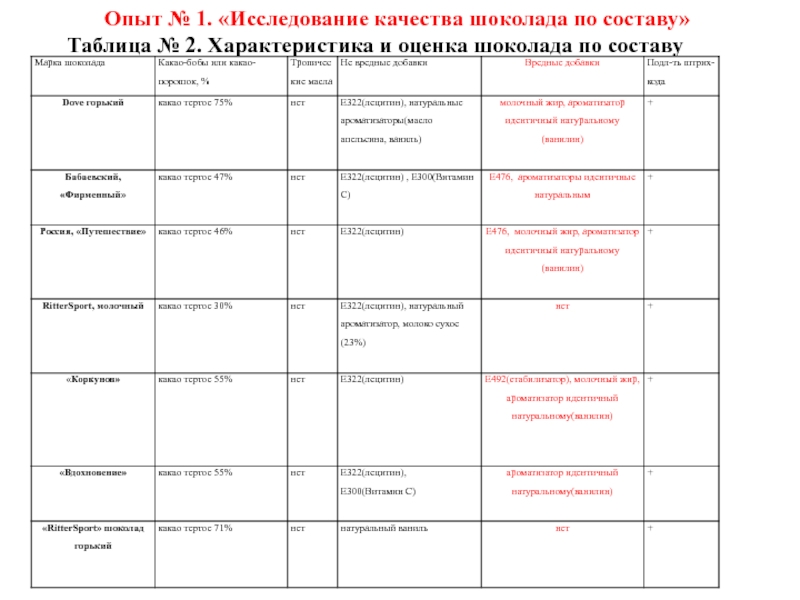 Слайд 9Опыт № 1 «Исследование качества шоколада по составу»