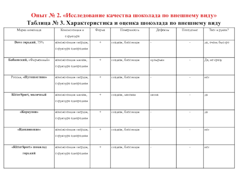 Опыт № 2. «Исследование качества шоколада по внешнему виду»