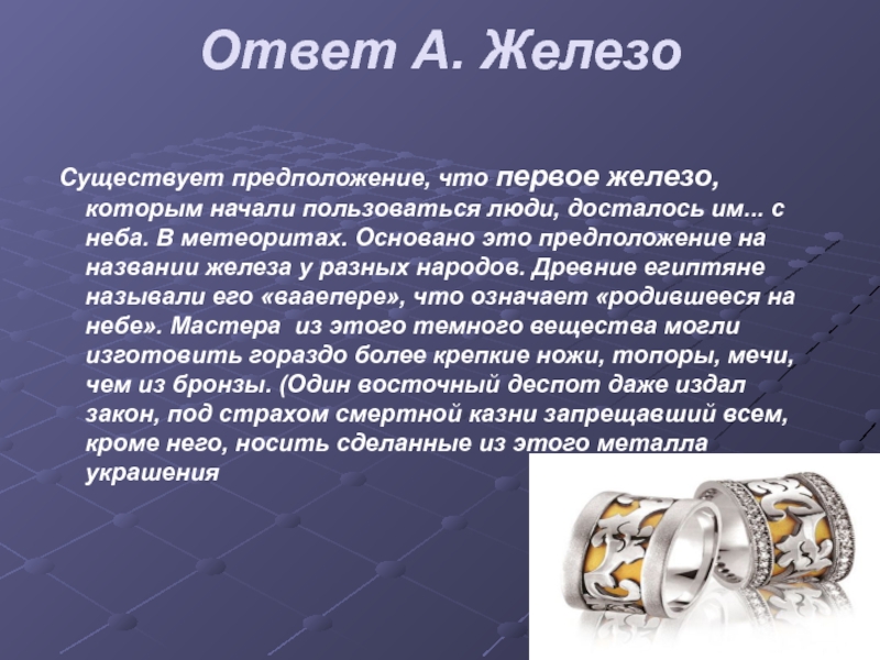 пользоваться люди, досталось им... с неба. В метеоритах. Основано это предположение на названии железа у разных народов. Древние египтяне называли его «вааепере», что означает «родившееся на небе». Мастера из этого темного вещества могли изготовить гораздо более крепкие ножи, топоры, мечи, чем из бронзы. (Один восточный деспот даже издал закон, под страхом смертной казни запрещавший всем, кроме него, носить сделанные из этого металла украшения