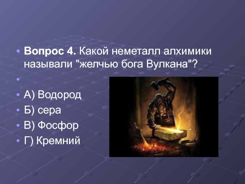 Вопрос 4. Какой неметалл алхимики называли "желчью бога Вулкана"?