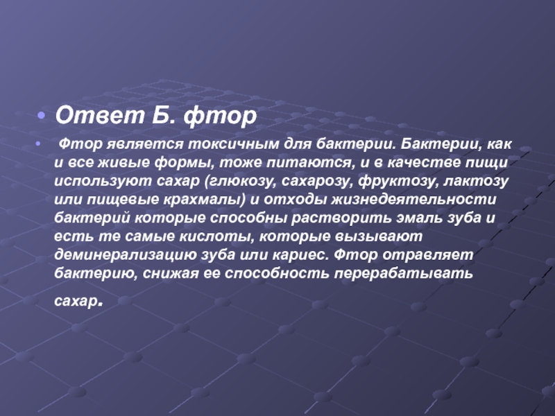 все живые формы, тоже питаются, и в качестве пищи используют сахар (глюкозу, сахарозу, фруктозу, лактозу или пищевые крахмалы) и отходы жизнедеятельности бактерий которые способны растворить эмаль зуба и есть те самые кислоты, которые вызывают деминерализацию зуба или кариес. Фтор отравляет бактерию, снижая ее способность перерабатывать сахар.