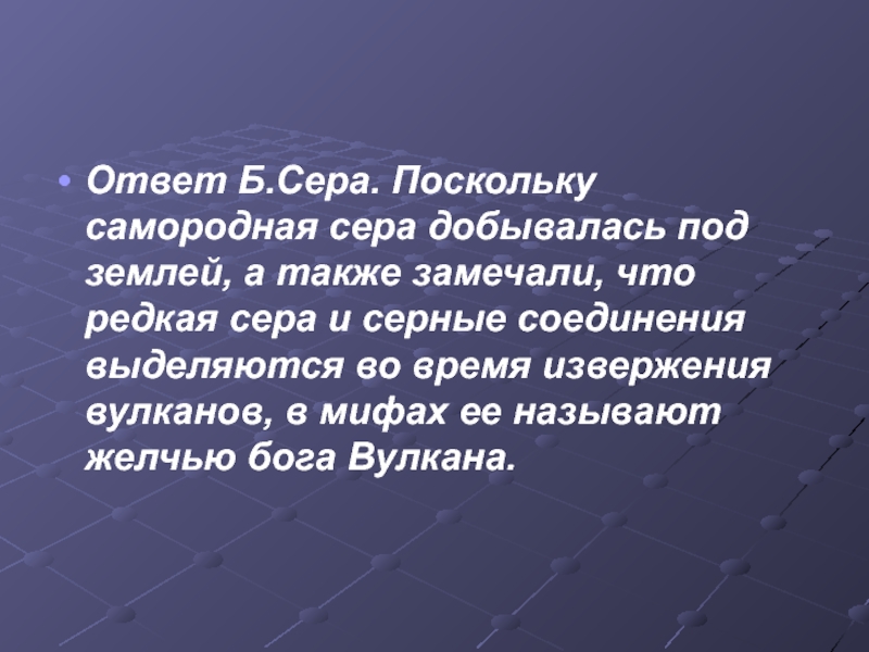 что редкая сера и серные соединения выделяются во время извержения вулканов, в мифах ее называют желчью бога Вулкана.