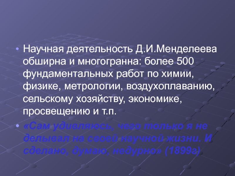 Слайд 6Научная деятельность Д.И.Менделеева обширна и многогранна: более 500 фундаментальных работ по