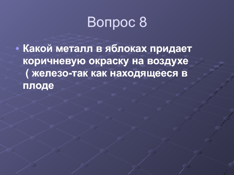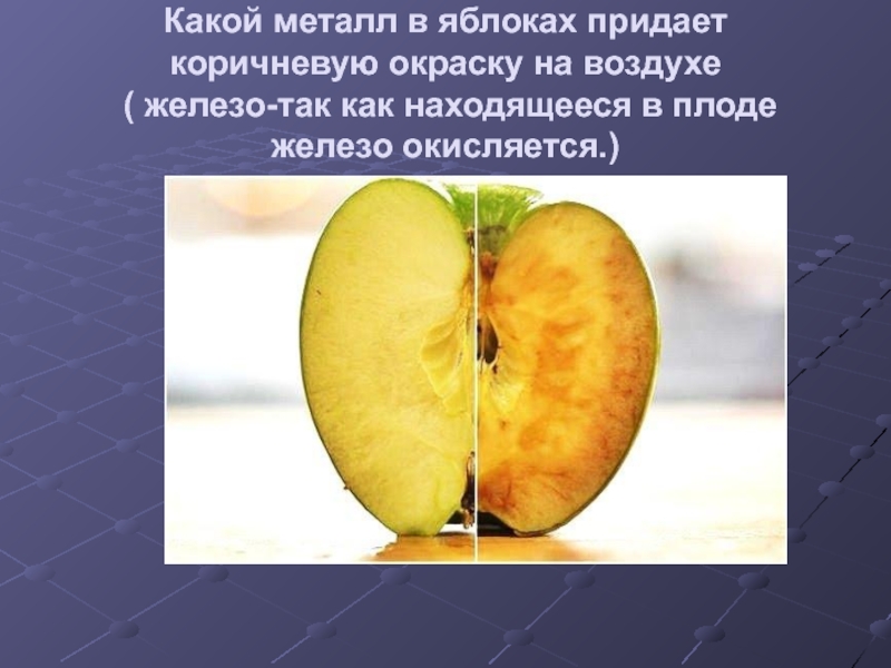 Слайд 40Какой металл в яблоках придает коричневую окраску на воздухе