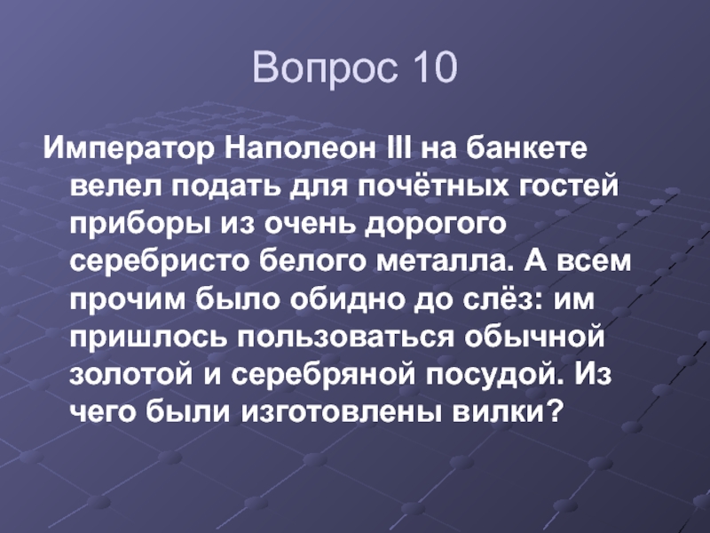 приборы из очень дорогого серебристо белого металла. А всем прочим было обидно до слёз: им пришлось пользоваться обычной золотой и серебряной посудой. Из чего были изготовлены вилки?