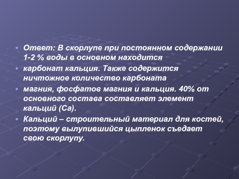 Вопрос 5.Этот химический элемент составляет 40% (по массе) основного состава скорлупы