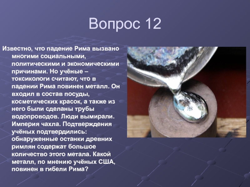 причинами. Но учёные – токсикологи считают, что в падении Рима повинен металл. Он входил в состав посуды, косметических красок, а также из него были сделаны трубы водопроводов. Люди вымирали. Империя чахла. Подтверждения учёных подтвердились: обнаруженные останки древних римлян содержат большое количество этого метала. Какой металл, по мнению учёных США, повинен в гибели Рима?