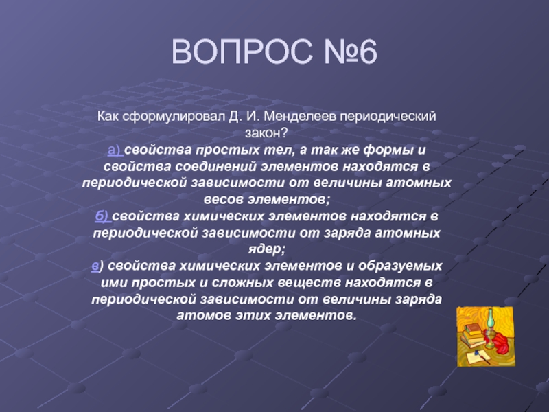 в) свойства химических элементов и образуемых ими простых и сложных веществ находятся в периодической зависимости от величины заряда атомов этих элементов.