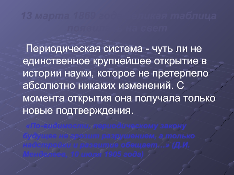 «По-видимости, периодическому закону будущее не грозит разрушением, а только надстройки и развитие обещает…» (Д.И.Менделеев, 10 июля 1905 года)