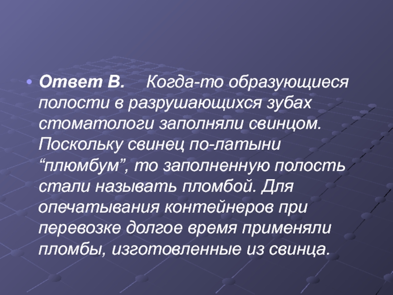 Ответ В. Когда-то образующиеся полости в разрушающихся зубах стоматологи заполняли свинцом.