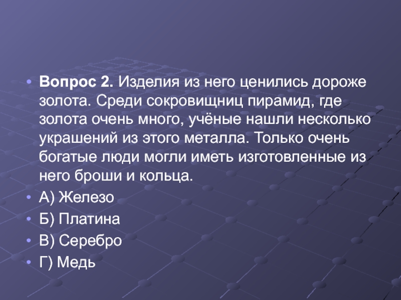 Вопрос 2. Изделия из него ценились дороже золота. Среди сокровищниц пирамид,