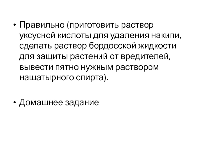 Слайд 25Правильно (приготовить раствор уксусной кислоты для удаления накипи, сделать раствор бордосской