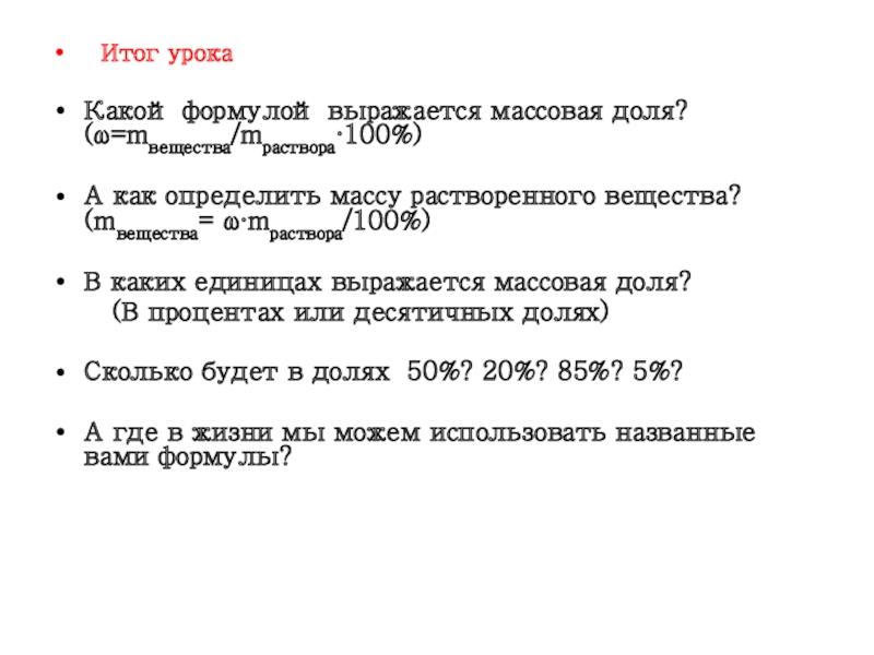 Какой формулой выражается массовая доля? (ω=mвещества/mраствора·100%)