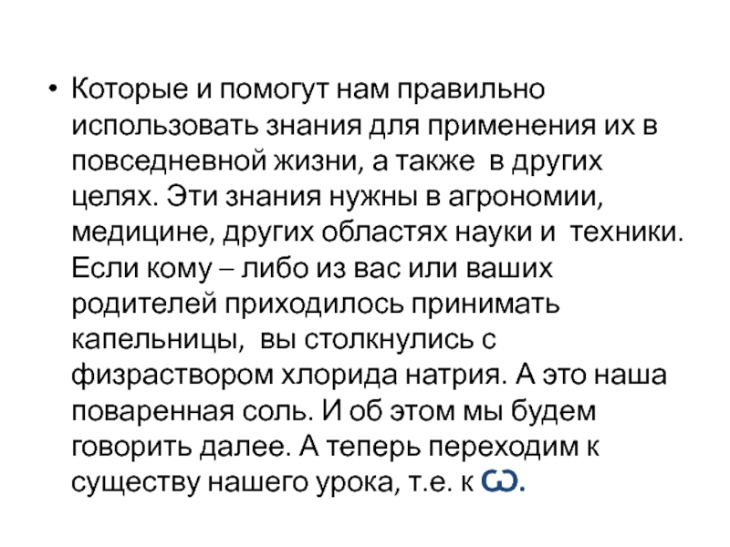 повседневной жизни, а также в других целях. Эти знания нужны в агрономии, медицине, других областях науки и техники. Если кому – либо из вас или ваших родителей приходилось принимать капельницы, вы столкнулись с физраствором хлорида натрия. А это наша поваренная соль. И об этом мы будем говорить далее. А теперь переходим к существу нашего урока, т.е. к Ѡ.