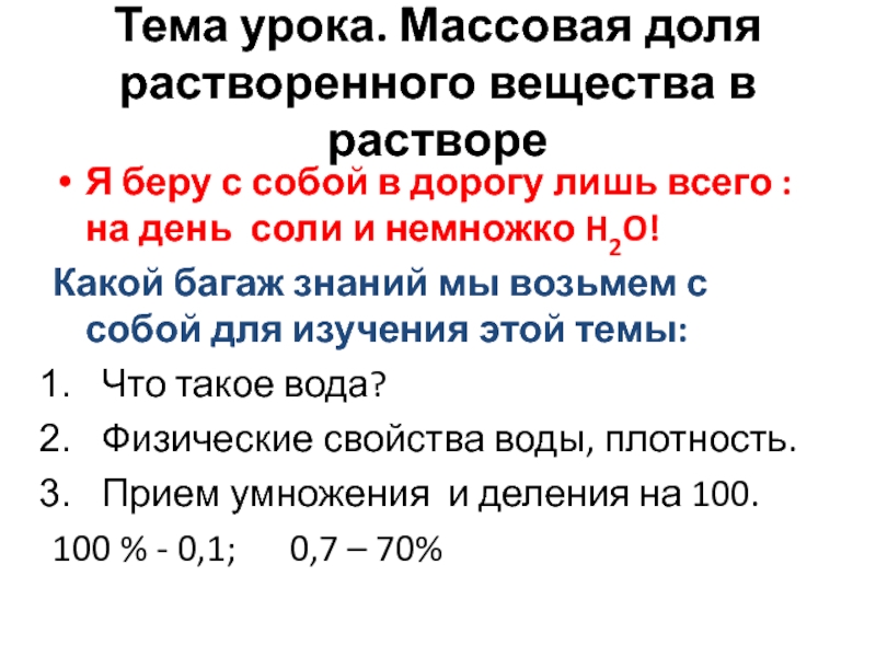 Слайд 4Тема урока. Массовая доля растворенного вещества в растворе