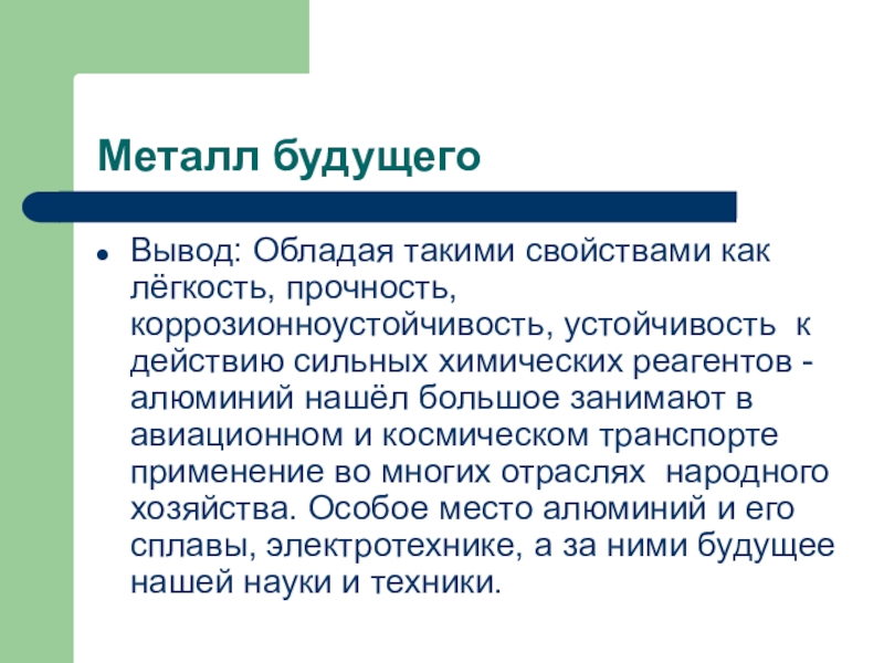 Металл будущегоВывод: Обладая такими свойствами как лёгкость, прочность, коррозионноустойчивость, устойчивость к действию сильных химических реагентов - алюминий