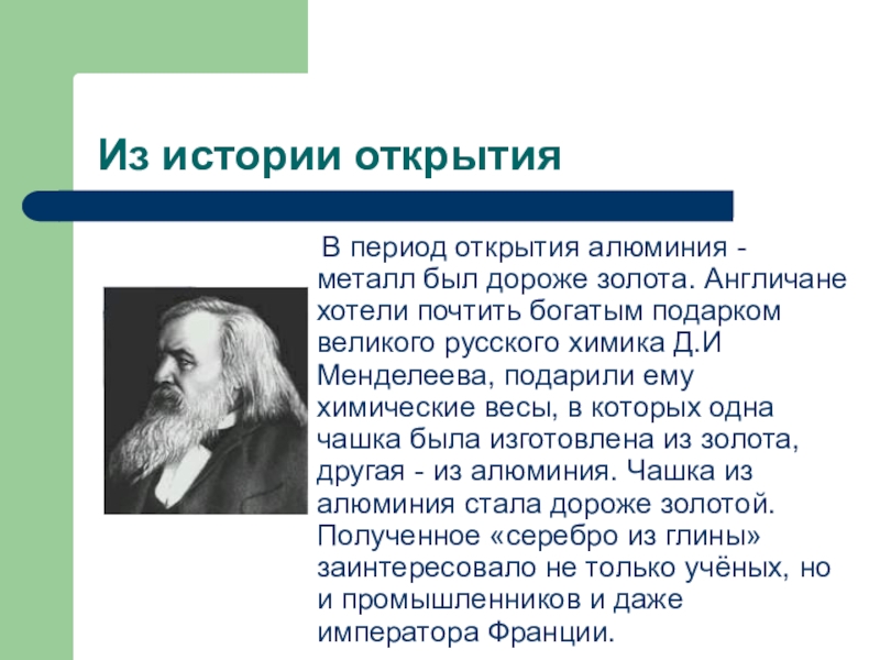 металл был дороже золота. Англичане хотели почтить богатым подарком великого русского химика Д.И Менделеева, подарили ему химические весы, в которых одна чашка была изготовлена из золота, другая - из алюминия. Чашка из алюминия стала дороже золотой. Полученное «серебро из глины» заинтересовало не только учёных, но и промышленников и даже императора Франции.