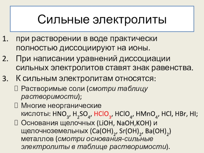 Сильные электролиты — диссоциируют полностью (соли, щелочи, а также сильные кислоты: HCl, HBr, HI, HNO3).