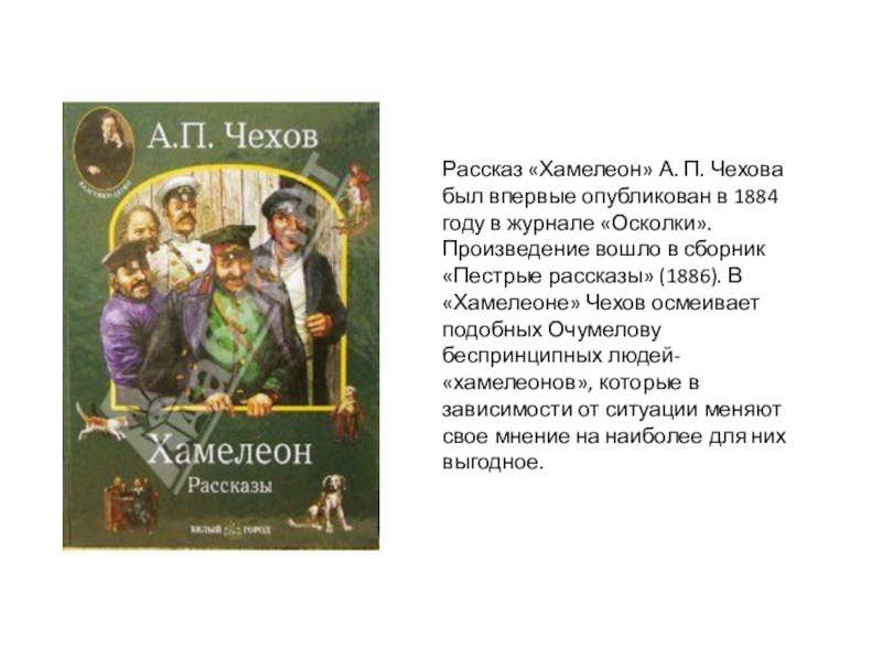 в журнале «Осколки». Произведение вошло в сборник «Пестрые рассказы» (1886). В «Хамелеоне» Чехов осмеивает подобных Очумелову беспринципных людей-«хамелеонов», которые в зависимости от ситуации меняют свое мнение на наиболее для них выгодное.