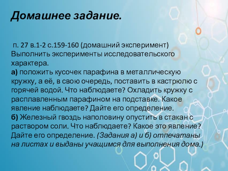 а) положить кусочек парафина в металлическую кружку, а её, в свою очередь, поставить в кастрюлю с горячей водой. Что наблюдаете? Охладить кружку с расплавленным парафином на подставке. Какое явление наблюдаете? Дайте его определение. б) Железный гвоздь наполовину опустить в стакан с раствором соли. Что наблюдаете? Какое это явление? Дайте его определение. (Задания а) и б) отпечатаны на листах и выданы учащимся для выполнения дома.)
