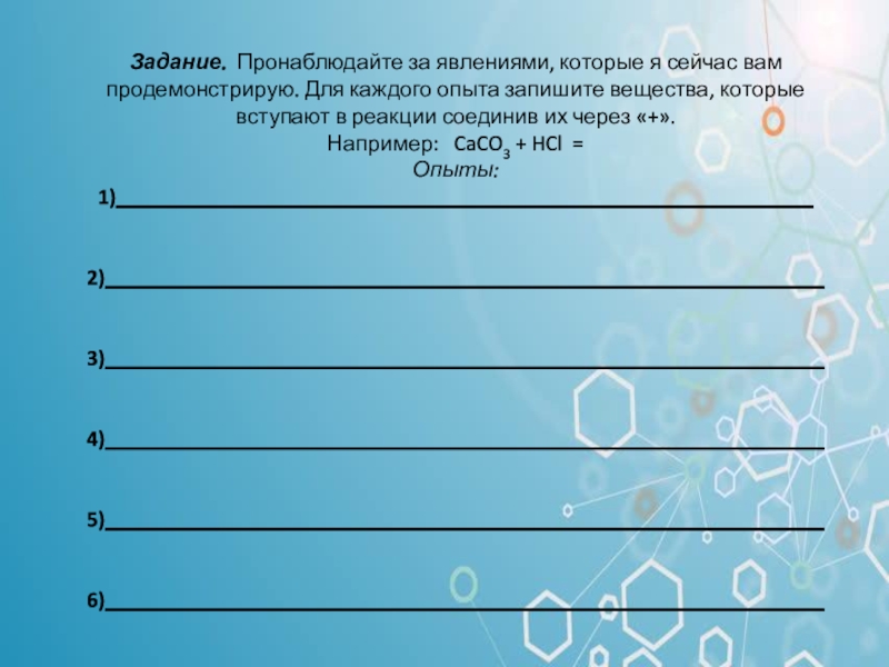 опыта запишите вещества, которые вступают в реакции соединив их через «+». Например: CaCO3 + HCl = Опыты: 1)_______________________________________________________________   2)_________________________________________________________________ 3)_________________________________________________________________   4)_________________________________________________________________   5)_________________________________________________________________   6)_________________________________________________________________