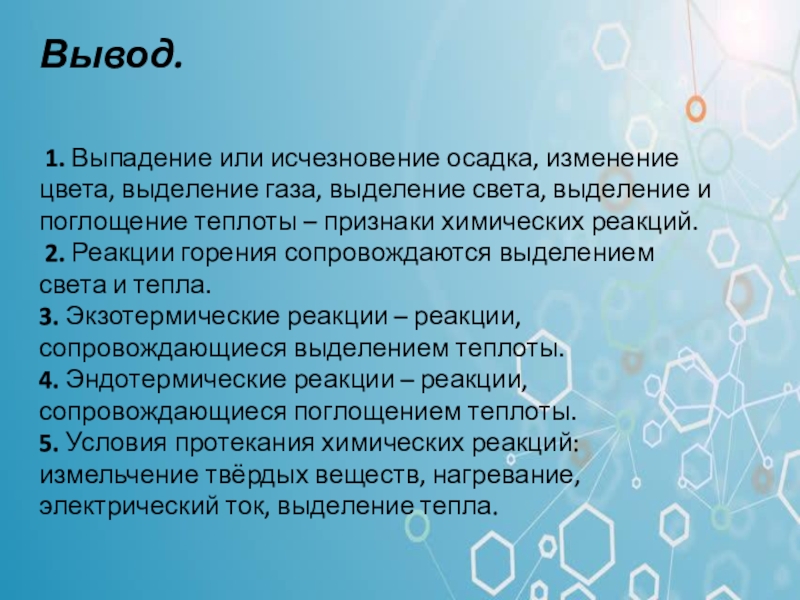 Слайд 16Вывод. 1. Выпадение или исчезновение осадка, изменение цвета, выделение газа, выделение