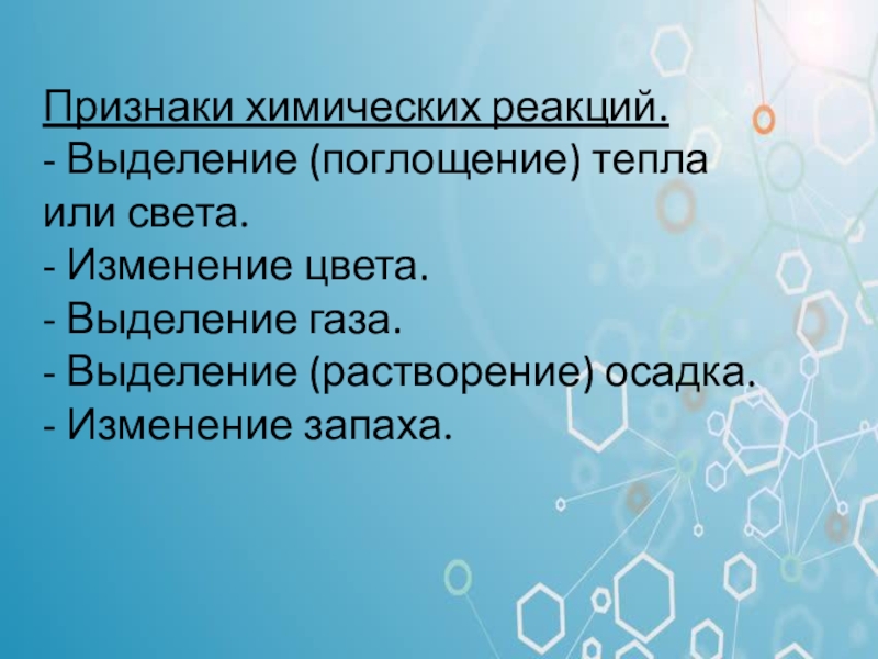 Признаки химических реакций. - Выделение (поглощение) тепла или света. - Изменение цвета. - Выделение газа. - Выделение