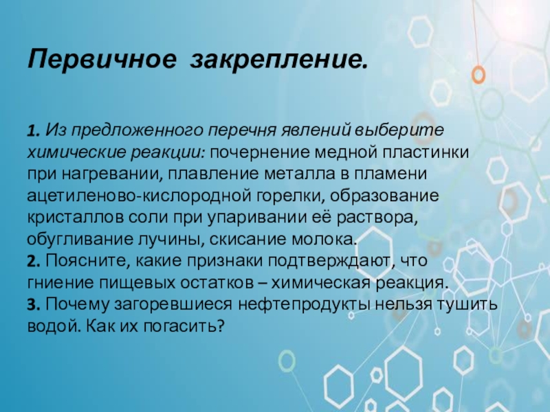 Слайд 15Первичное закрепление. 1. Из предложенного перечня явлений выберите химические реакции: почернение медной