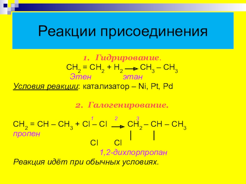 более химически активные вещества, что обусловлено наличием двойной связи, состоящей из σ- и π-связей. Алкены способны присоединять два одновалентных атома или радикала за счёт разрыва π-связи, как менее прочной.