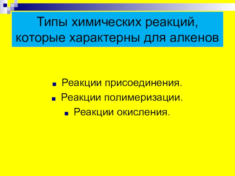 Слайд 15Типы химических реакций, которые характерны для алкенов