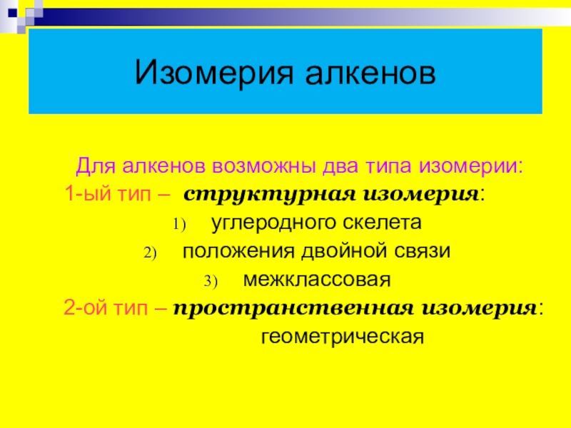 Для алкенов возможна пространственная изомерия, поскольку вращение относительно двойной