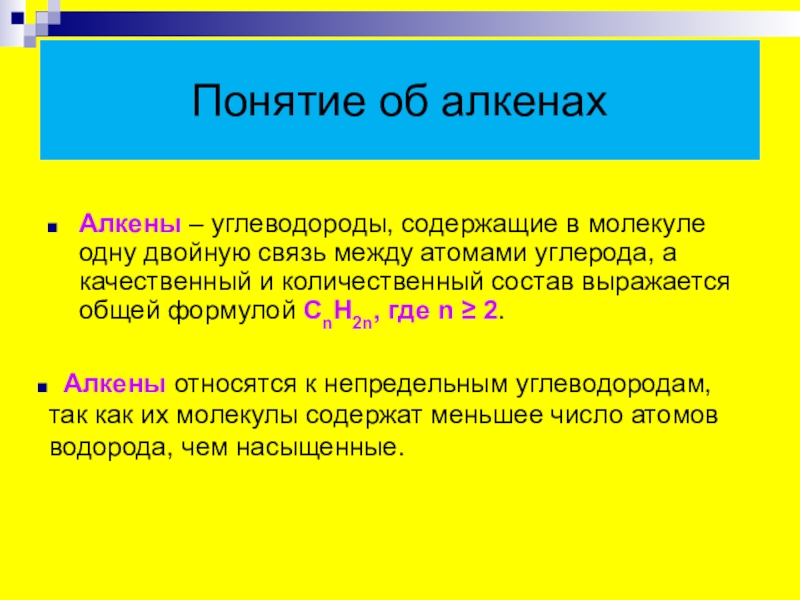 Алкены – углеводороды, содержащие в молекуле одну двойную связь