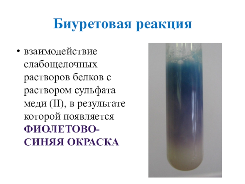 Биуретовая реакциявзаимодействие слабощелочных растворов белков с раствором сульфата меди (II), в результате которой появляется фиолетово-синяя окраска