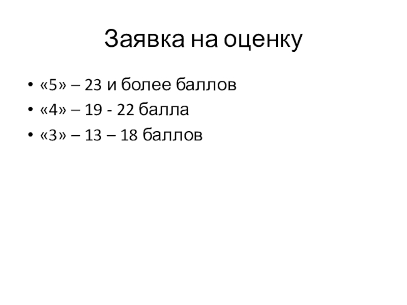 Заявка на оценку«5» – 23 и более баллов«4» – 19 - 22 балла«3» – 13 – 18