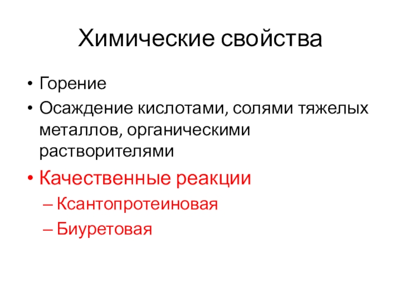 Химические свойства Горение Осаждение кислотами, солями тяжелых металлов, органическими растворителямиКачественные реакцииКсантопротеиноваяБиуретовая