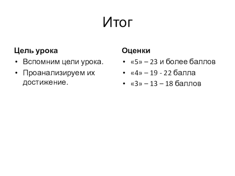 Итог Цель урока Оценки Вспомним цели урока.Проанализируем их достижение.«5» – 23 и более баллов«4» – 19 -