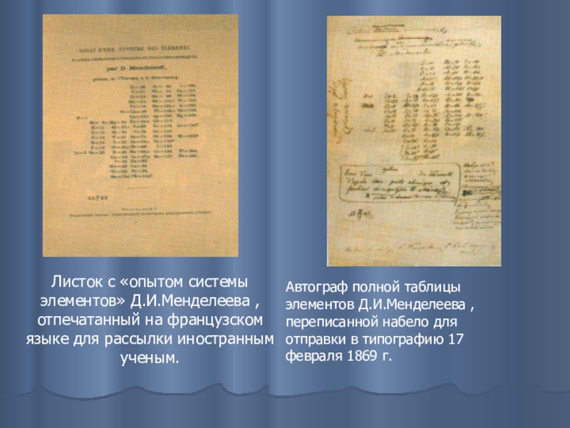 Автограф полной таблицы элементов Д.И.Менделеева , переписанной набело для отправки в типографию 17 февраля 1869 г.