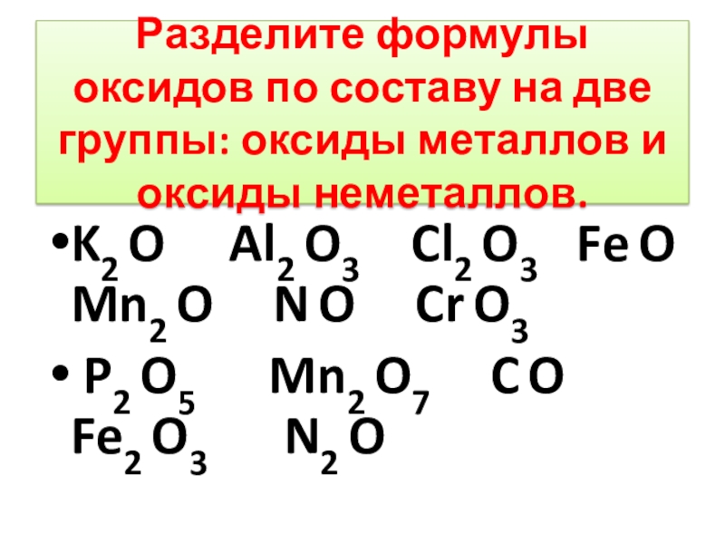 Слайд 2Разделите формулы оксидов по составу на две группы: оксиды металлов и