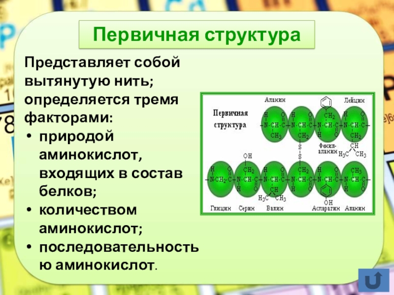 А) последовательность аминокислотных звеньев в линейной полипептидной цепи: