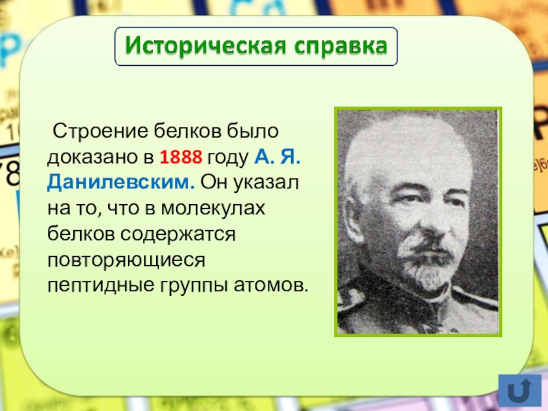 Слайд 9 Строение белков было доказано в 1888 году А. Я. Данилевским.