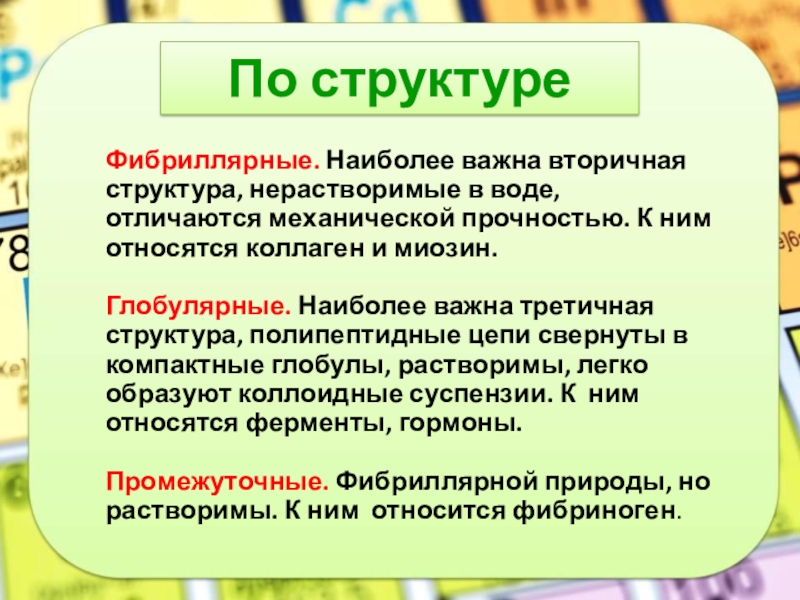 Глобулярные. Наиболее важна третичная структура, полипептидные цепи свернуты в компактные глобулы, растворимы, легко образуют коллоидные суспензии. К ним относятся ферменты, гормоны.